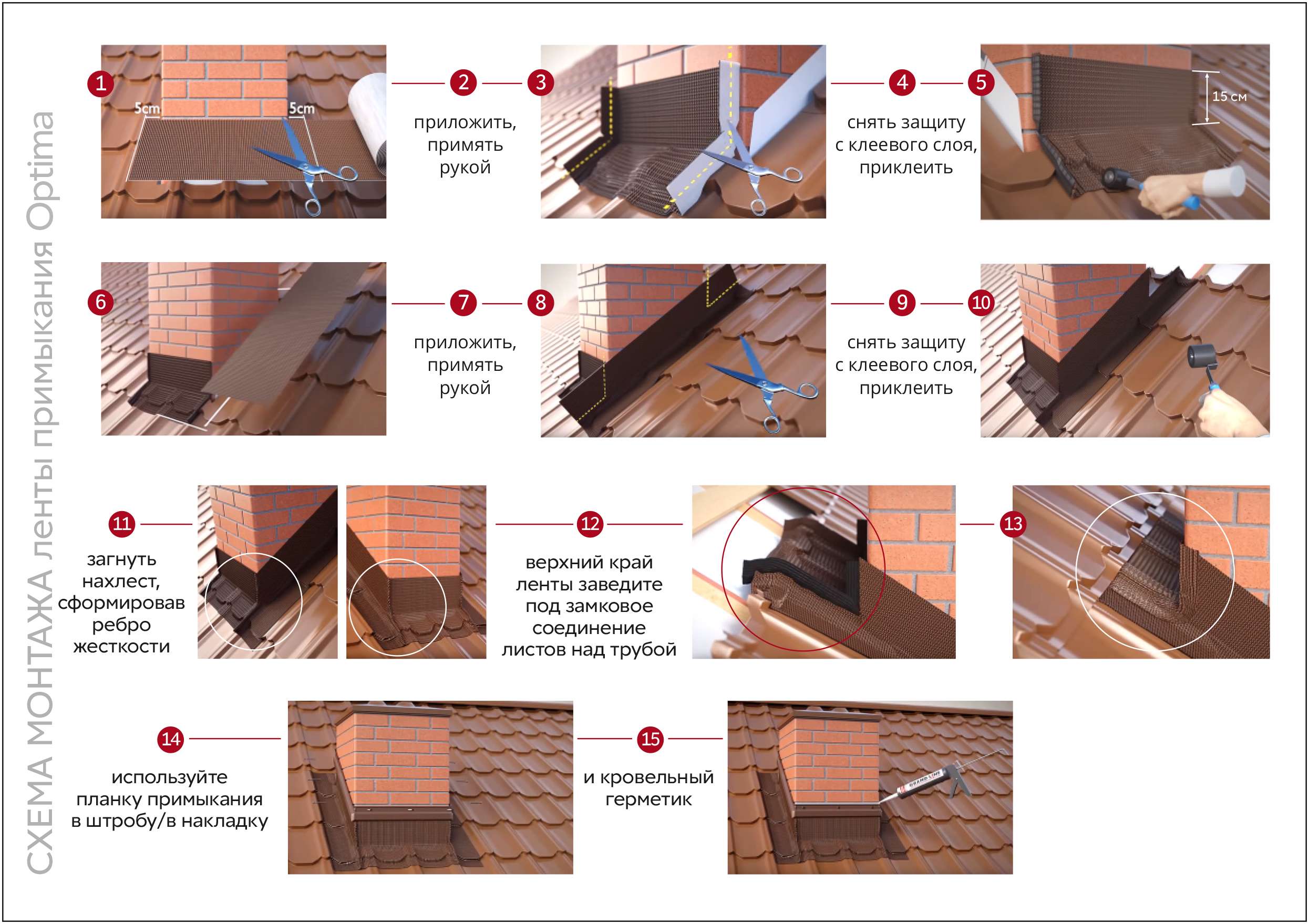 Применяется для отделки дымоходов, а также различных выступающих элементов и примыканий кровли к стенам. Гофрированная лента легко принимает любую форму - это удобно в работе с угловыми или труднодоступными местами на крыше.